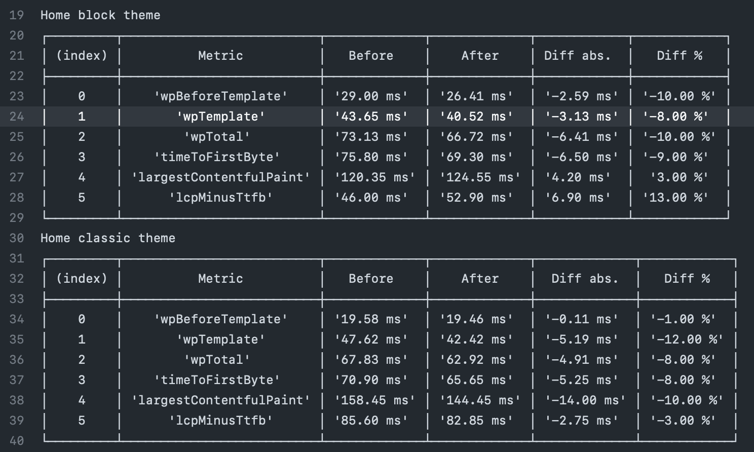 That said, I'm also using the Docker core dev environment for these benchmarks, via npm run env:start, so that alone isn't it. Are you maybe having XDebug enabled? Or WP_DEBUG as true? I usually disable any of those things when benchmarking as they can slow things down (especially profiling like XDebug). Again, it shouldn't matter too much though, as long as your own benchmarks use the same consistent environment.