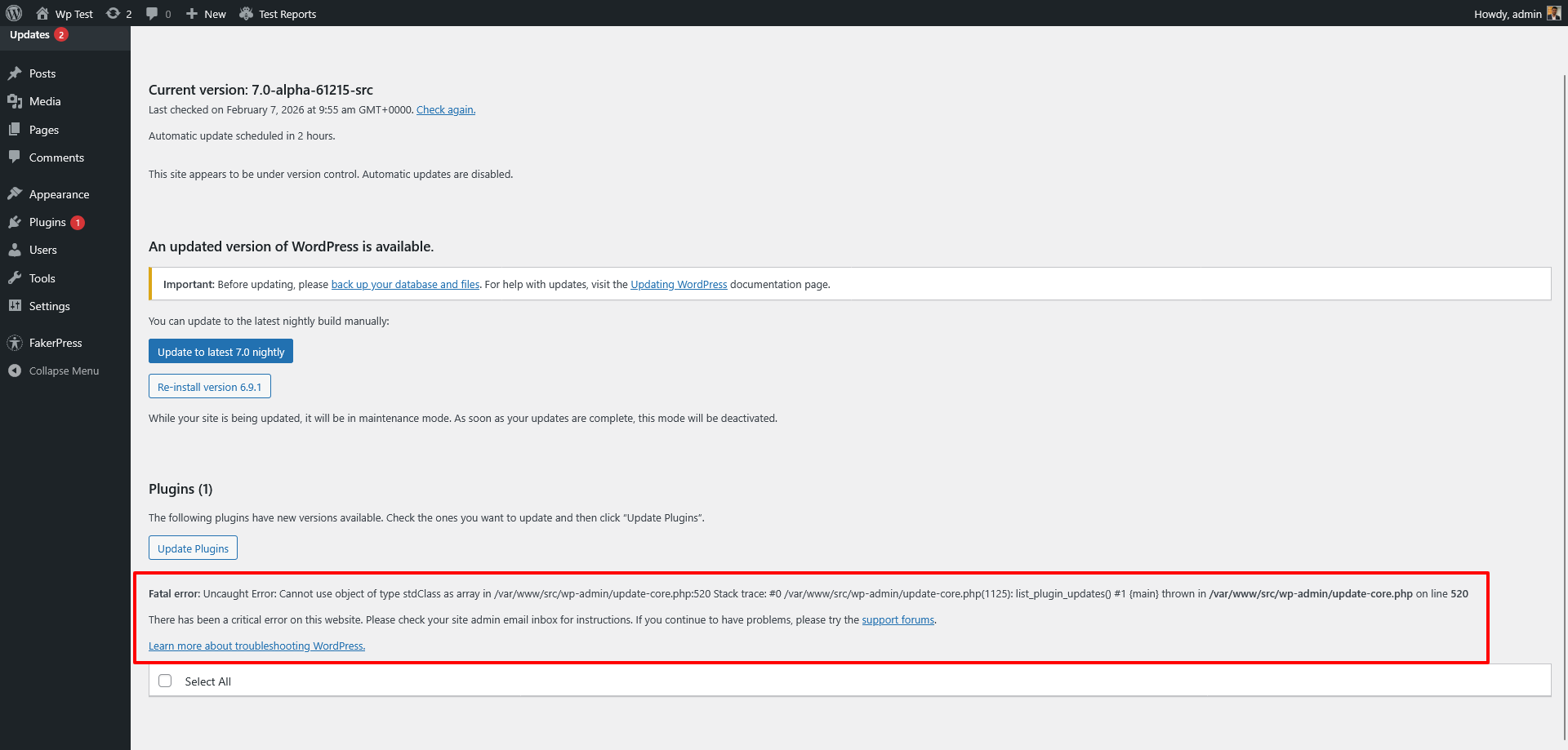 /wp-admin/update-core.phpand scroll to Plugins section. - ✅ Error condition occurs (reproduced).
