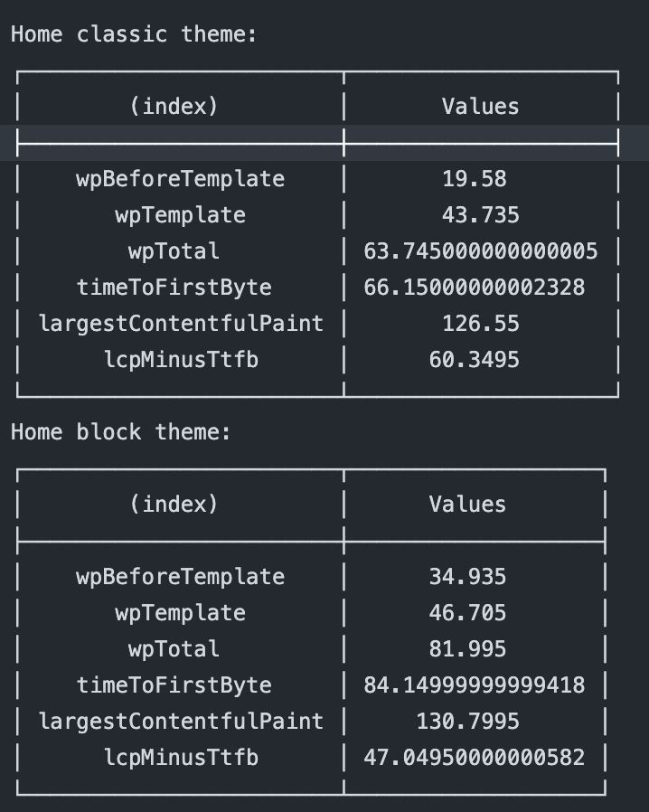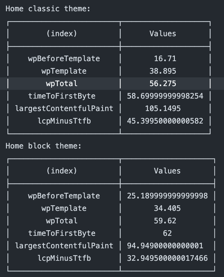 - TTFB for block themes has gone from 88.14ms to 62ms: -26ms, 29.65% faster.