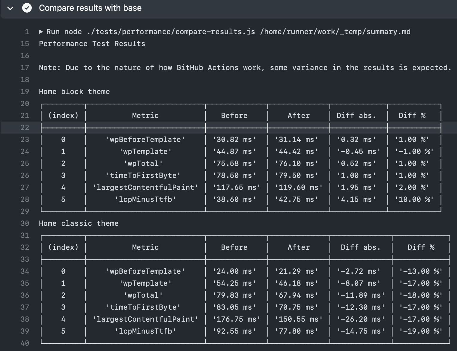 I'm sure y'all have seen the Due to the nature of how GitHub Actions work, some variance in the results is expected. disclaimer at the top. The comparison table is a nice addition, but we still have a lot of work to do to reduce the variance in the current performance test setup, i.e. clearing caches, actually logging out the user, doing more iterations, etc.