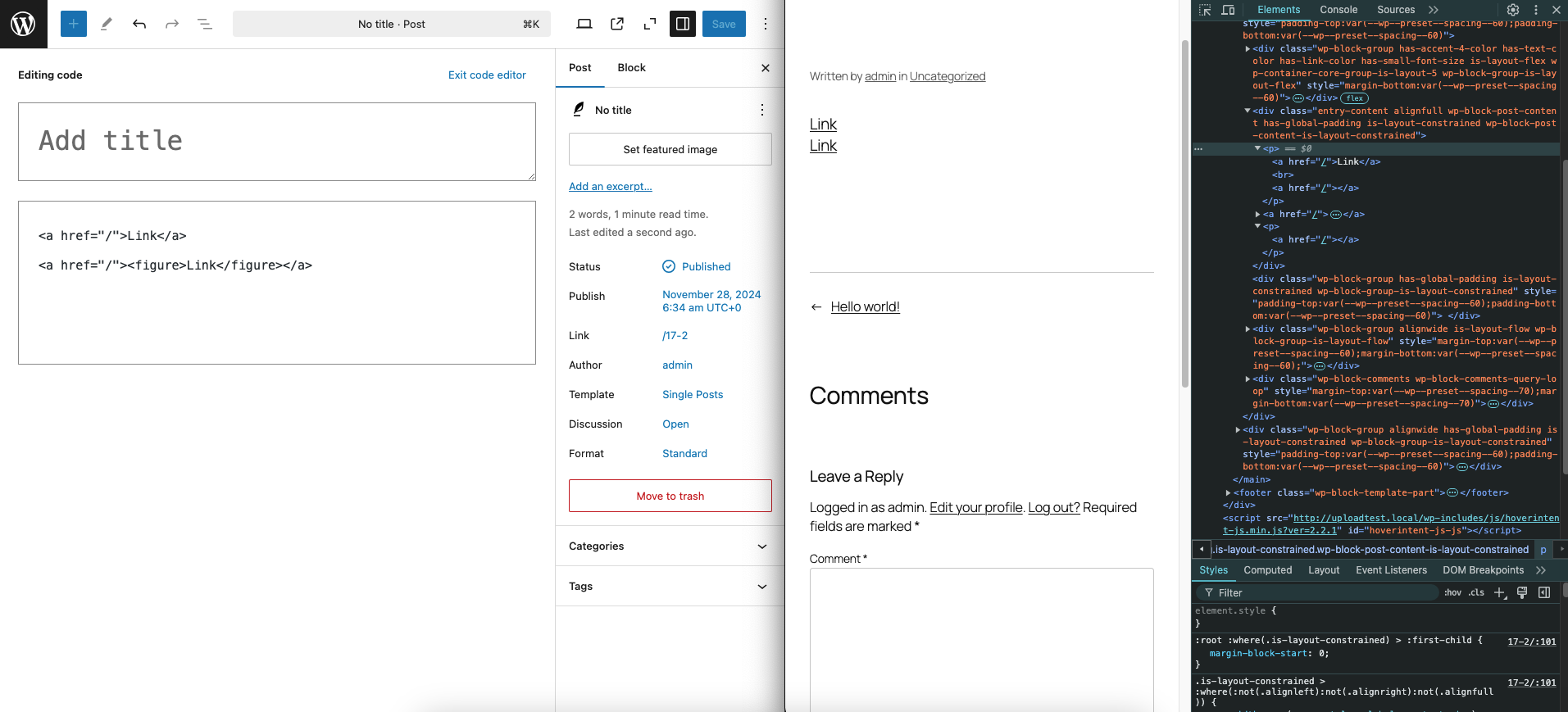 <p><a href="/">Link</a></p> <p><a href="/"></p> <figure>Link</figure> <p></a></p>
