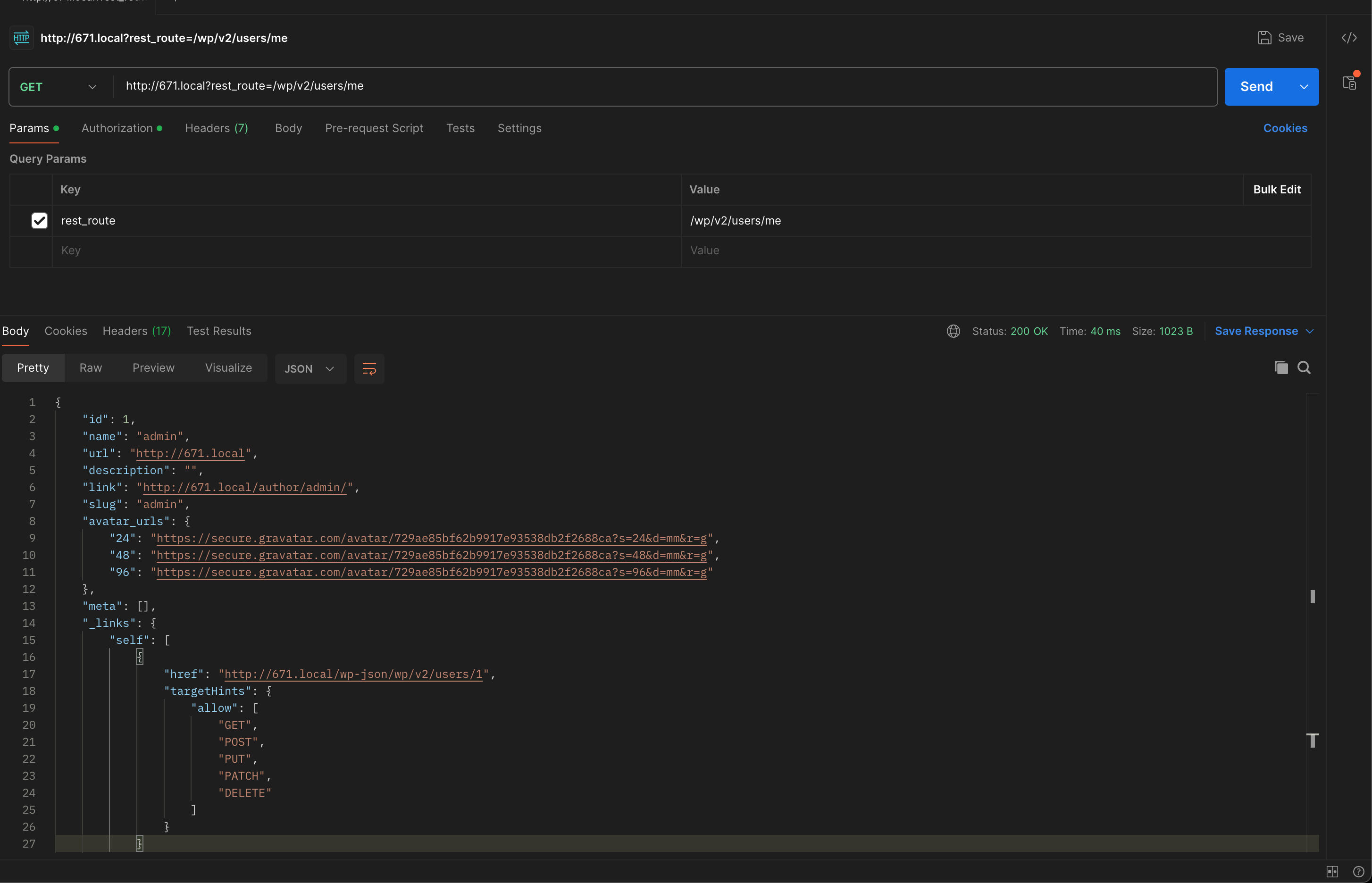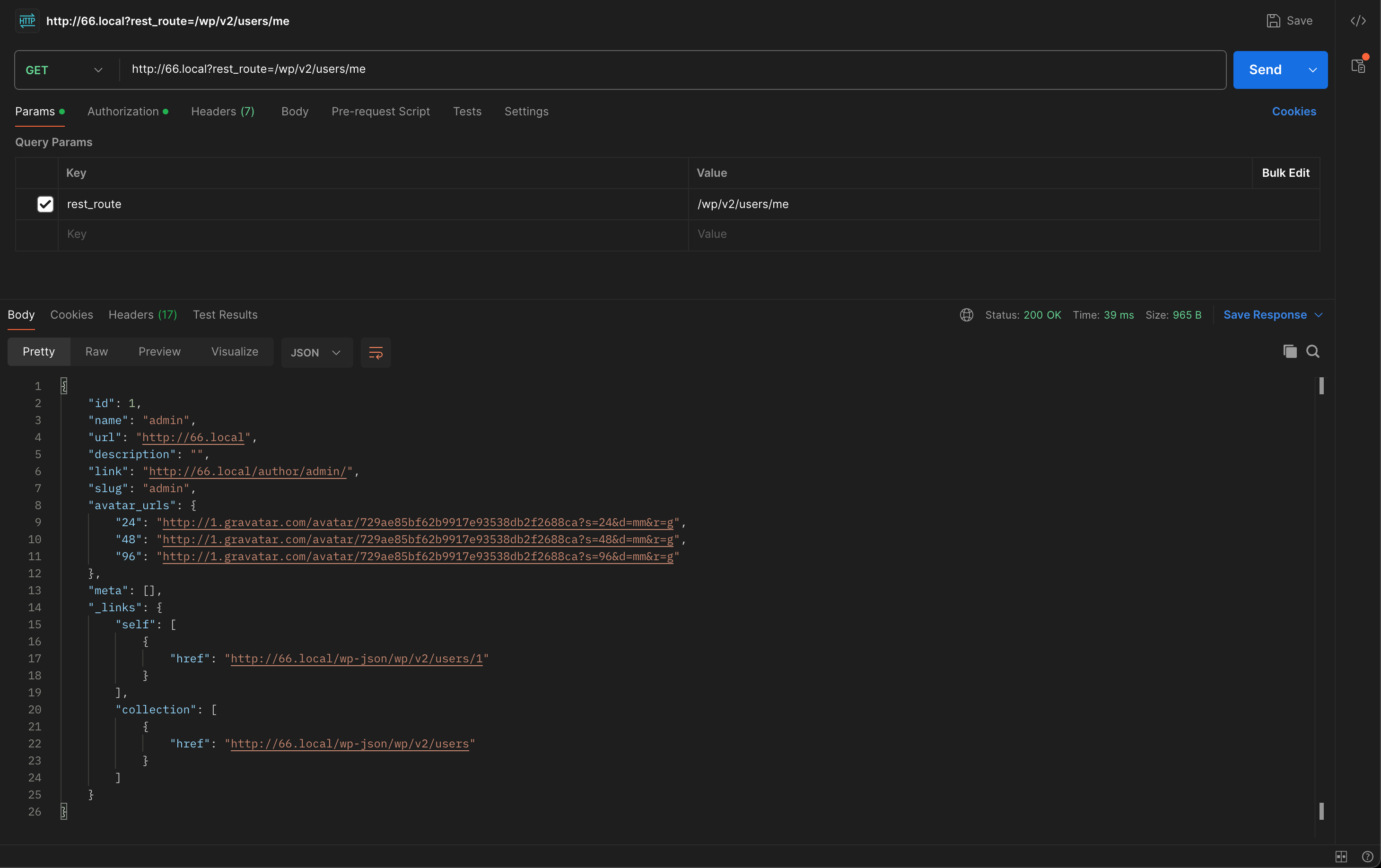 The rest API /?rest_route=/wp/v2/users/me